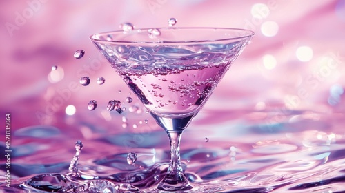 A pink martini glass filled with a pink liquid and surrounded by water splashes against a pink and purple background.