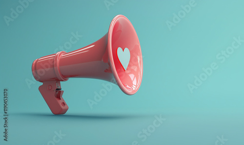A pink megaphone with a heart cutout against a teal background, symbolizing communication and love.