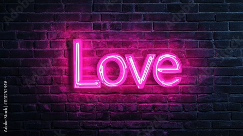 A pink neon sign that reads "Love" glowing against a dark brick wall.