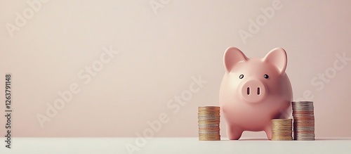 A pink piggy bank surrounded by stacks of coins on a soft pastel background, symbolizing savings