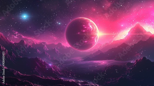 A pink planet hangs in a swirling nebula, casting a warm glow on a fantastical alien landscape.