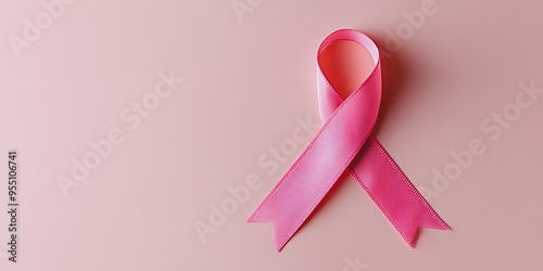 A pink ribbon, a symbol of breast cancer awareness, against a pastel pink background.