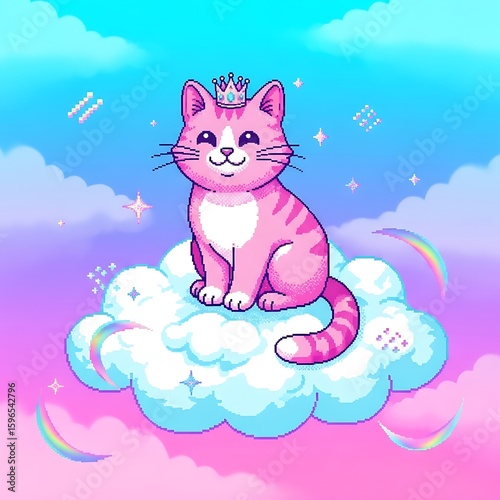 A pink striped cat wearing a crown sits on a fluffy white cloud against a pastel sky with stars and rainbows.