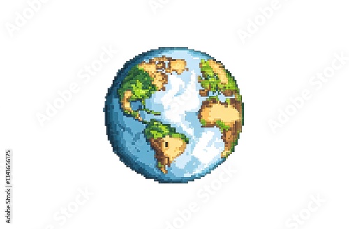 A pixel art representation of Earth, showcasing continents like North and South America, blue oceans, and green landmasses, retro 8-bit style, vibrant colors, isolated on a white background
