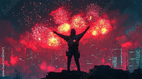 A pixel hero celebrating victory under neon fireworks