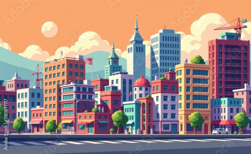 A pixelated cityscape illustration featuring a mix of modern skyscrapers and historic buildings, set against a vibrant blue sky with fluffy clouds.