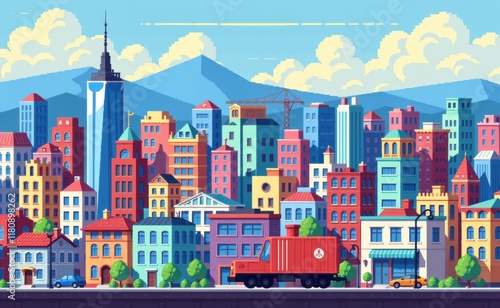 A pixelated cityscape illustration featuring a mix of modern skyscrapers and historic buildings, set against a vibrant blue sky with fluffy clouds.