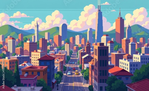 A pixelated cityscape illustration featuring a mix of modern skyscrapers and historic buildings, set against a vibrant blue sky with fluffy clouds.
