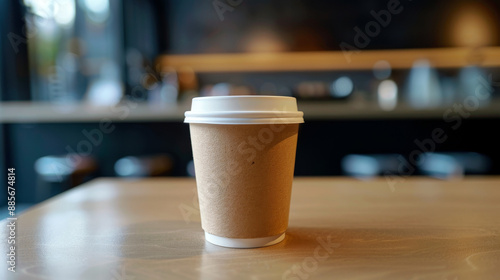 A plain brown cardboard coffee cup rests on a table.