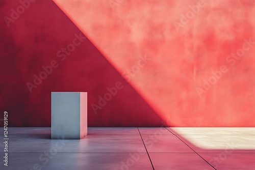 A plain red wall paired with a pedestal forms a minimalist backdrop in the stock image.