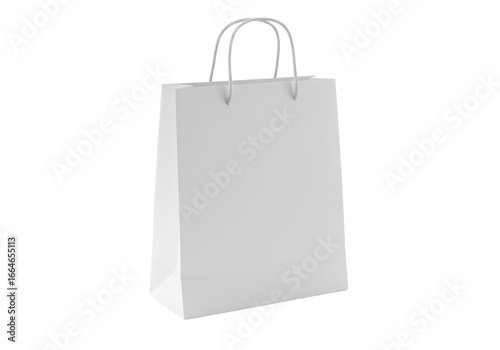 A plain white paper shopping bag with twisted handles, new and clean, centered against a pure bright white studio background, high-key lighting. Concept of modern commerce and eco-conscious practices
