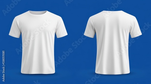 A plain white t-shirt is showcased from the front and back, presenting a clear view of its design and fit. The vibrant blue background enhances the t-shirt's clean look