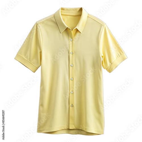 A plain yellow short sleeve button down shirt with a collared neck. Generative AI