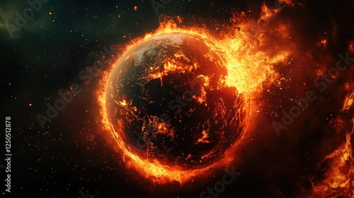 A planet on the verge of collapse, glowing with fiery red fractures and surrounded by flames, symbolizing global warming.