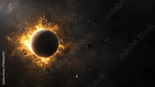 A planet with a fiery atmosphere and scattered asteroids in space.