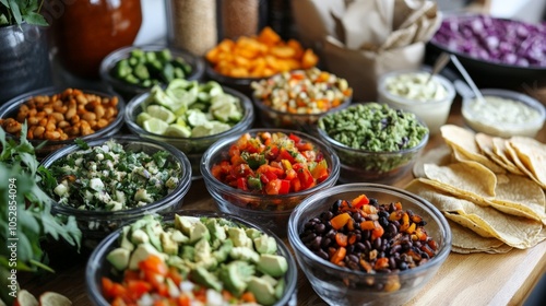 A plant-based taco bar with an array of fillings such as grilled veggies, beans, guacamole, and vegan sour cream, perfect for a party.
