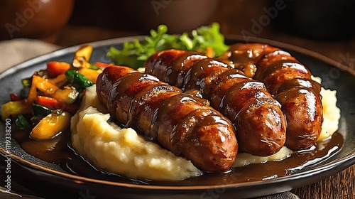 A plate featuring sausages on mashed potatoes with gravy and a side of mixed vegetables.