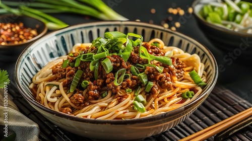 A plate of appetizing noodles with soy bean paste is presented. The noodles are long and chewy, topped generously with a rich and savory soy bean paste sauce. Mixed within the sauce are small pieces o