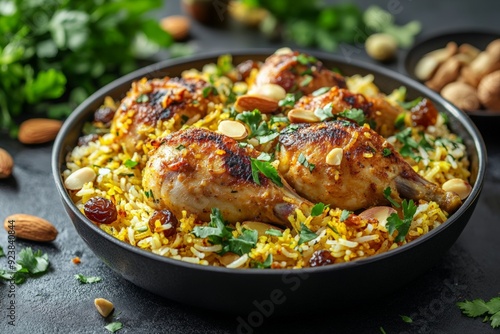 A plate of Arabian chicken mandi, featuring grilled chicken served over spiced rice with raisins and almonds, garnished with fresh herbs.