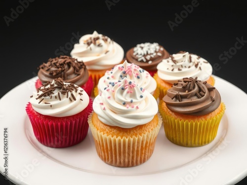 A plate of assorted cupcakes with different toppings such as chocolate shavings and sprinkles, cake, celebration
