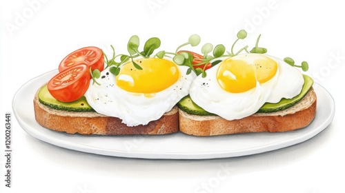 a plate of avocado toast topped with poached eggs, cherry tomatoes, and microgreens