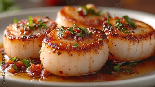 A plate of beautifully seared scallops garnished with herbs and sauce.