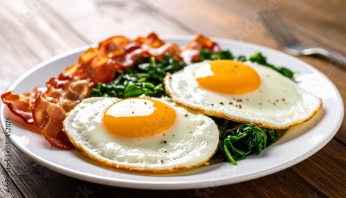 A plate of breakfast featuring two fried eggs, crispy bacon strips, and fresh spinach on a wooden table.