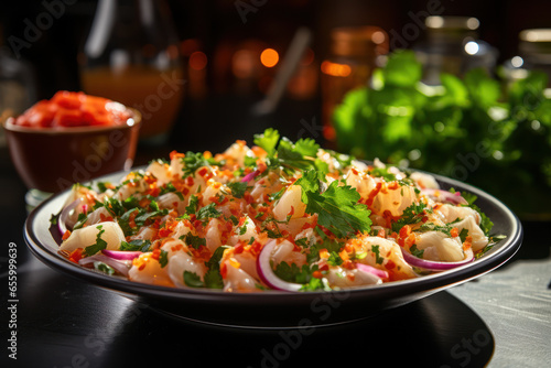 A plate of ceviche, a Peruvian dish of fresh seafood marinated in citrus juices, with onions and cilantro. Concept of Peruvian seafood cuisine. Generative Ai.