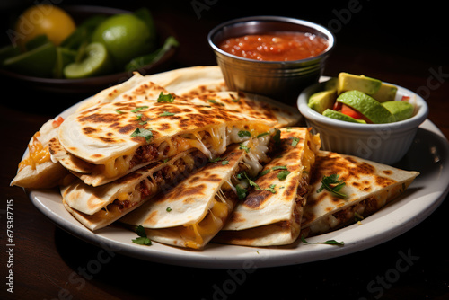 A plate of cheesy quesadillas, oozing with melted goodness and served with a side of salsa. Concept of cheesy comfort. Generative Ai.