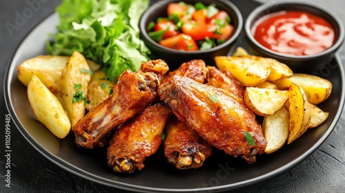 A plate of chicken wings with potato wedges, a bowl of tomato salsa and a bowl of red sauce.