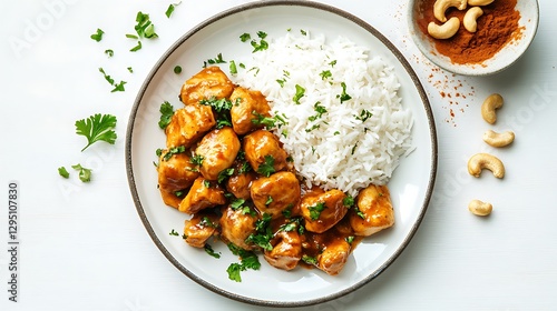 A plate of chicken with cashew nuts and rice