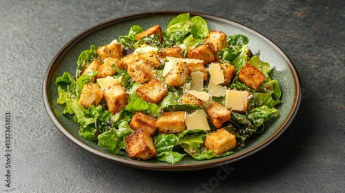 A plate of classic Caesar salad with crispy croutons and parmesan. Featuring freshness and flavor