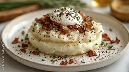 A plate of creamy mashed potatoes topped with bacon, herbs, and a poached egg.