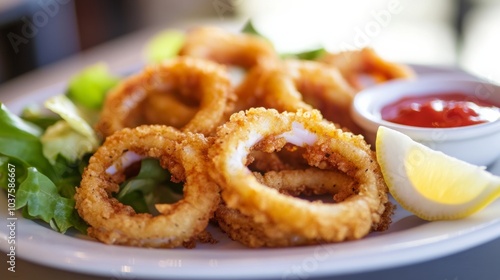 A plate of crispy calamari rings served with marinara sauce and lemon wedges, Calamari rings centered, Golden brown and crispy coating