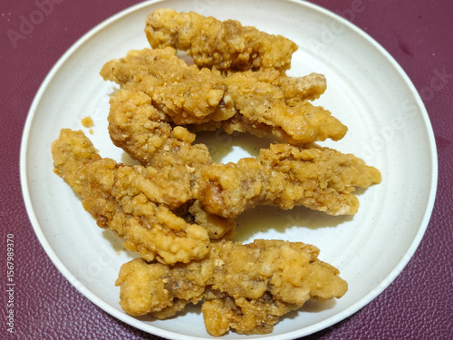 A plate of crispy golden fried chicken fillet, served on a blurred background.