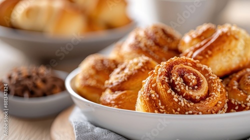 A plate of delicious cinnamon rolls topped with sesame seeds is the focus of this image, representing baking, desserts, and a delightful snack moment.