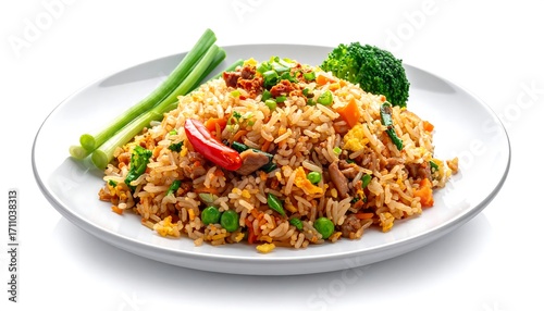 A plate of flavorful fried rice, piled high with vegetables, meat, and eggs, garnished with green onions and broccoli florets.