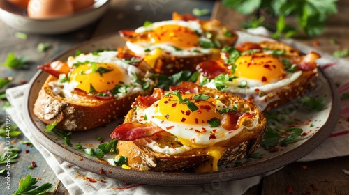 A plate of four egg sandwiches with bacon and parsley. The plate is on a wooden table