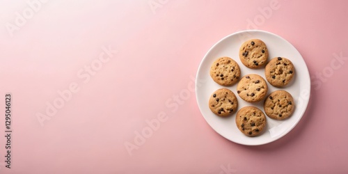 A plate of freshly baked chocolate chip cookies on a pink background, perfect for a sweet treat or a delightful snack