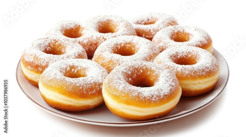 A plate of freshly made donuts with powdered sugar, set against a clean white background. Classic and comforting.
