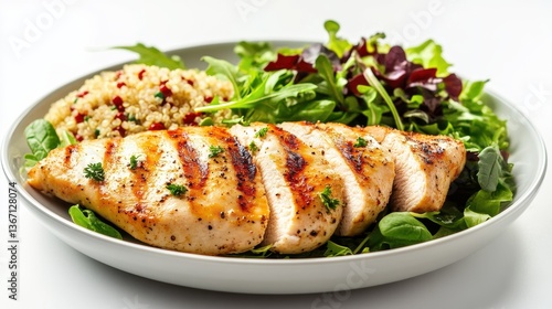A plate of grilled chicken breast with a side of quinoa and mixed greens, placed on a white background. Lean and protein-packed. illustration