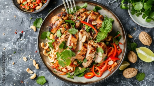 A plate of grilled chicken served with spicy papaya salad, garnished with peanuts and fresh herbs