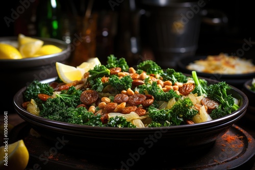 A plate of kale sautéed with pine nuts and raisins, generative IA