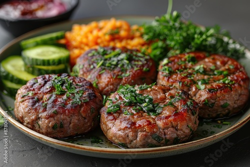 A plate of kotleti, Russian meat patties, served with mashed potatoes and a side of pickled vegetables.