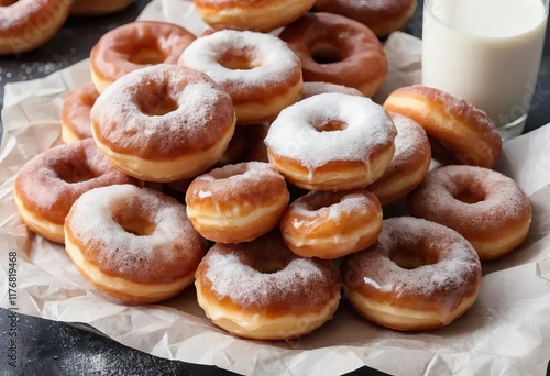 A plate of mini doughnuts with a glass of milk and a bowl of sugar next to it