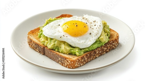 A plate of multigrain toast with smashed avocado and a poached egg, isolated on a white background, showcasing a trendy, nutritious breakfast option.