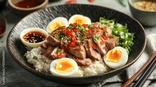A plate of pork leg rice topped with soft-boiled eggs, pickled vegetables, and a tangy dipping sauce, ready for a delicious meal.