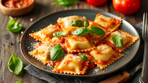 A plate of ravioli with cheese and spinach filling, covered with tomato sauce and basil leaves, served with a fork and a knife.