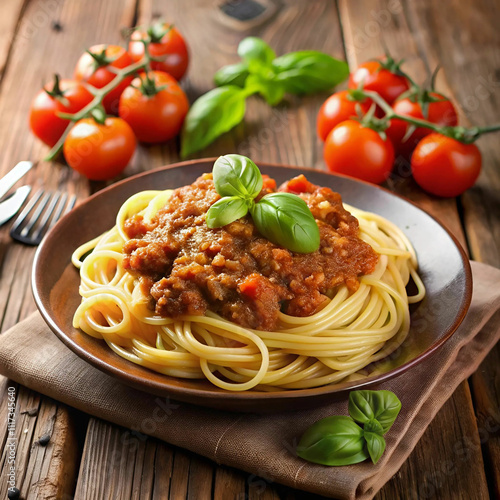 A plate of spaghetti topped with rich Bolognese sauce, garnished