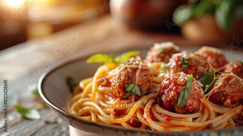 A plate of spaghetti with meatballs, tomato sauce and a sprinkle of cheese